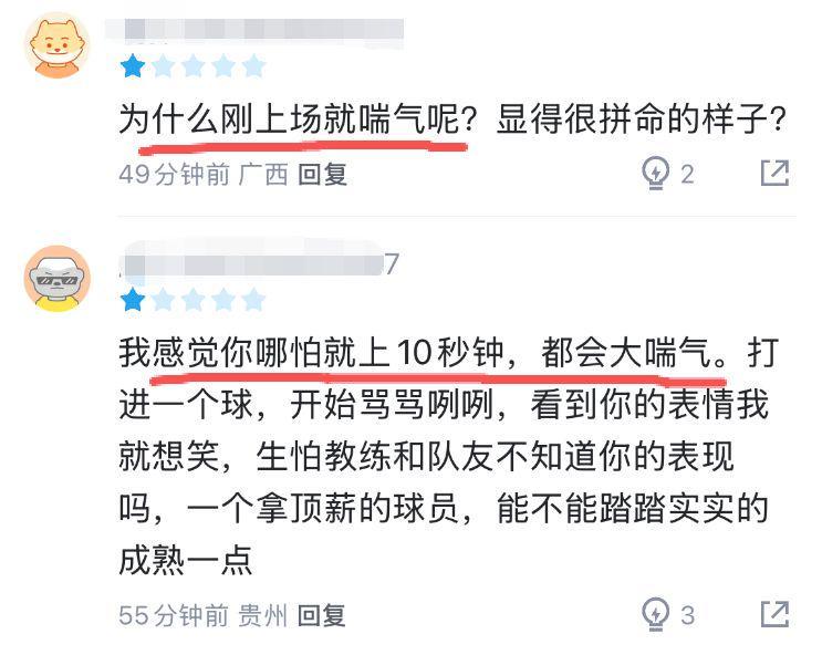 对于职业球员而言,运动喘气虽然是一件稀松平常的事情,但范子铭在上场时间如此有限的情况下,体能却相当差。这场比赛他只打了2分多钟,却在场上大喘气,不少球迷也调侃道:“哪家制氧企业可以请做个代言了,感觉一上场总是大喘气。”